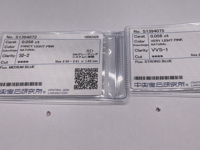 ナチュラルPINKカラーダイヤモンド ルース ルース 2個ペア 共に 0.056 ct×2 Fancy light PINK VVS-1 0.056ct Strong Blue (CGL艦) Fancy light PINK SI-2 0.056ct Medium Blue (CGL艦) 「中央宝石研究所=CGL」鑑定書付属 今とんでもなく高価になってしまった、ピンクダイヤモンド。 天然のピンクダイヤモンドは、 すべての天然ダイヤモンド産出の約0.01%だけで、 そのうち宝石として利用できるのはそのまた1万分の1とも言われている 奇跡の宝石です。 しかも2020年10月に、ピンクダイヤモンドの約90%を供給していた アーガイル鉱山が閉山してから言うもの、価格は高騰の一途。 それはそう、新しいマイニングがほぼ消失してしまったのですから。 そんなニュースもあって、一般的なダイヤモンドの価格が 安めに推移している中で、ピンクを筆頭に「カラーダイヤモンド」全体が 今注目されています。 もちろん、カラーダイヤモンドは一般的な4c’sとは評価が異なり、 カラーだからなんでも高価と言うわけではありません。 その色調が好みかどうかもありますが、できれば 明るくて彩度が高い方が良いのです。 このルースは「FANCY」がちゃんとついている、 リアルピンクダイヤとなります。 ポイントはこのルースはペアで持っていただきたいもの。 それは2つとも全く同じ FANCY LIGHT PINK(CGL鑑)で サイズすら0.056 ctである奇跡のペアだと言うこと。 この大きさだと一粒仕立てはちょっと寂しいと思えます。 しかし2粒ペアだと、リングのセンターに無色の大き目を用意し サイドにセットしたり、イヤリングにしたりと 一気に用途が広がるではありませんか。 一個手に入っても、同じようなものをもう一つ 後から揃えるのは超難関。 これは偶然「お前ら兄弟だった!?」って感じで揃っていたので ペアでの販売としました。 しかし安心してください格安です!! なお写真の色目は参考です。CGL鑑別書のカラーを優先してください。 ※ルースの取り扱いには万全の注意を払ってください。ジュエリー制作を希望される場合は、専門家にご相談ください。