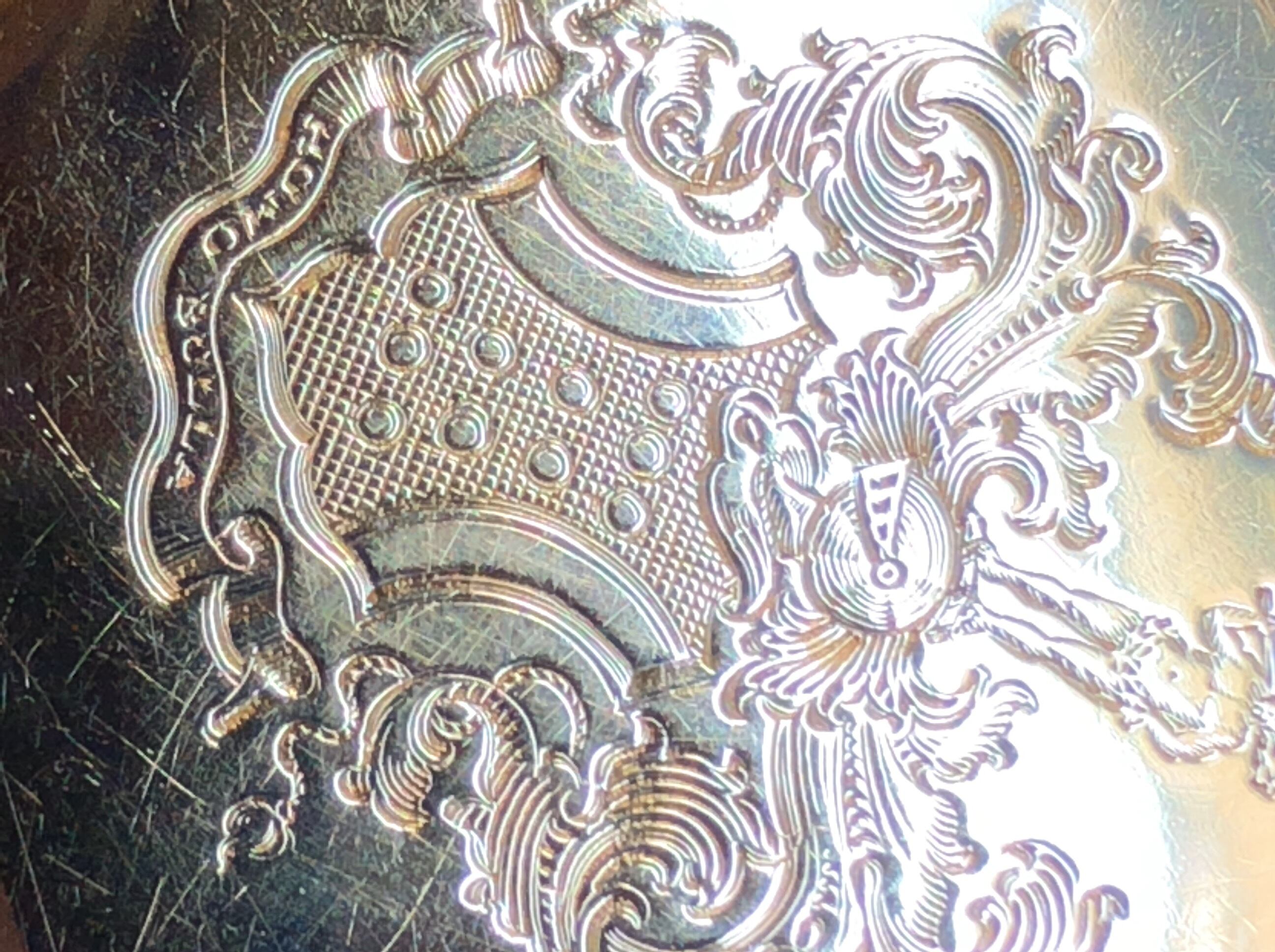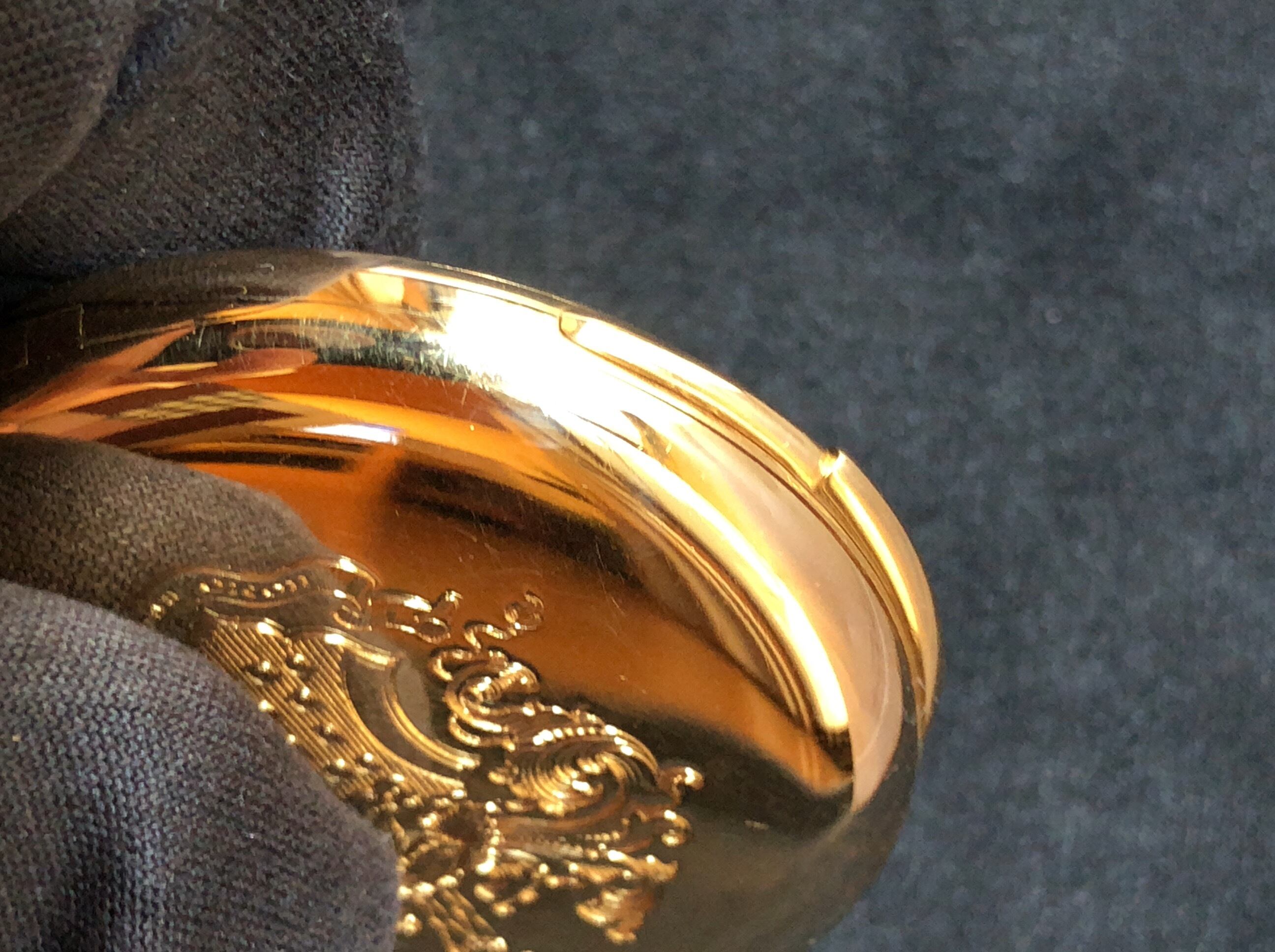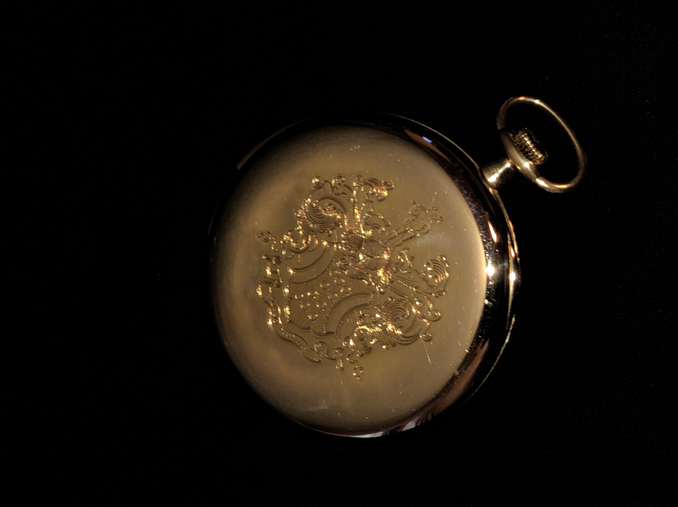 裏蓋に細かく手彫りさえた紋章がありますが、これはアメリカのロックフェラー家の紋章。