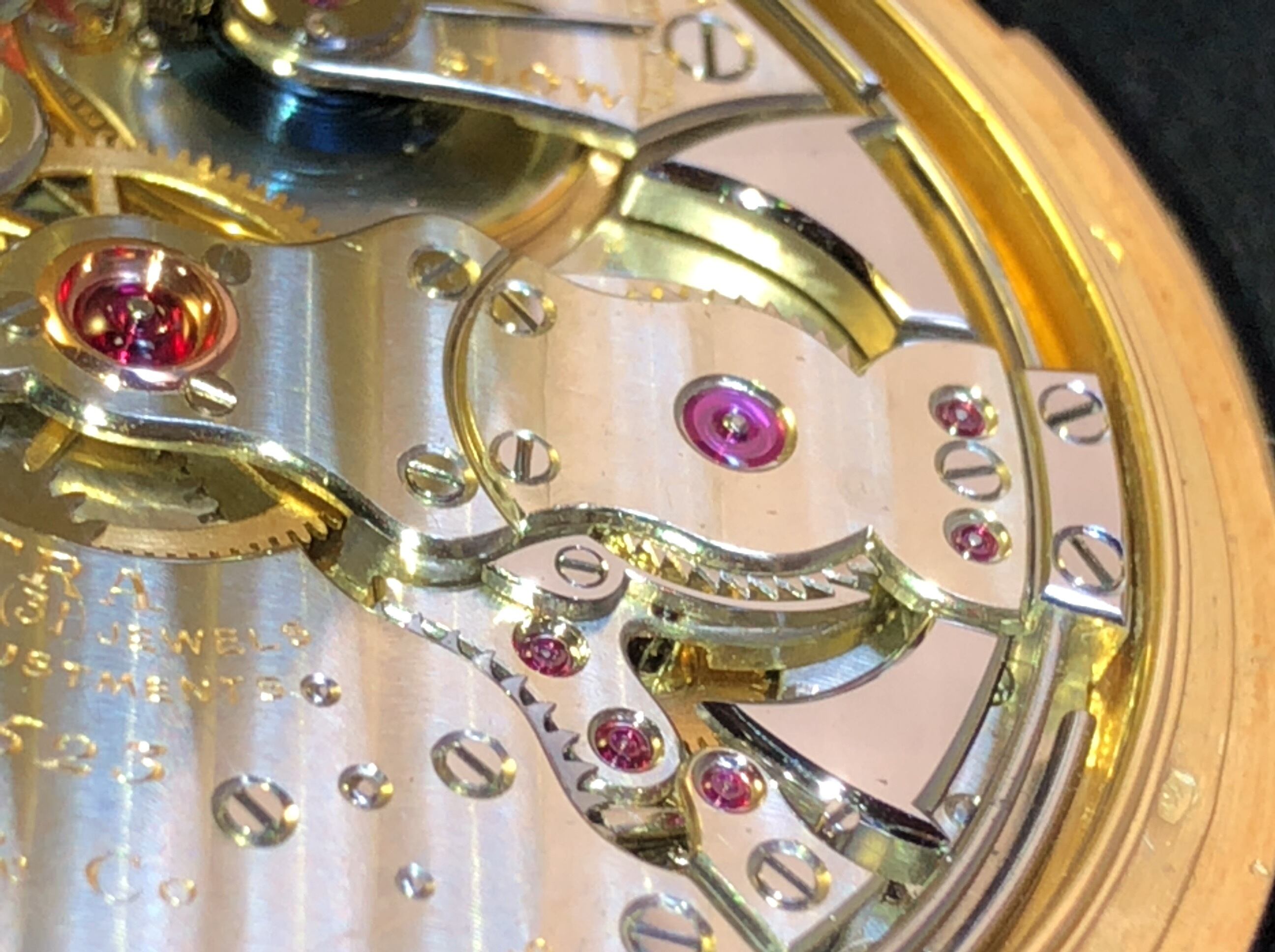 ドテピンと呼ばれるレフトアングルを決める所が、ルビーで、爪石の様に調整が可能、しかもルビーだから摩耗しない。